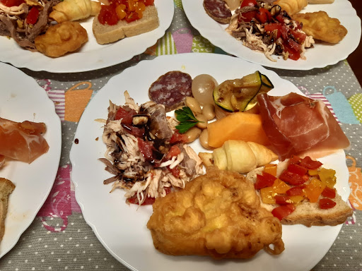 30/03/2025: Nos dijimos que nos saltaríamos la pasta. Luego nos sentamos en Punta agli Schiavi y nos informaron del especial diario. Raviolis con relleno de mascarpone, pera y pecorino, en una salsa ligera con pequeños tomates cherry. Así que, sí, podríamos hacer una excepción. Y fueron un triunfo: ligero, delicado, delicioso. Y lo que siguió también fue maravilloso. En esta región, piensas que piada, vale piada, ya lo hemos tenido. Pero esta piada con fino, casi hasta el punto de desaparecer, con un ligero brillo de aceite de oliva y fragante a romero. Lo comimos con el antipasto de capicolla, haciendo pequeños bocadillos. Siguieron porciones de asado de cerdo, asado de cordero, y puede haber habido algún asado de conejo arrojado allí para buena medida. Acompañantes de alcachofas y acelga y bietola. Agua y vino, café y sorbetes. En resumen, satisfactorio y memorable. Sin duda volveremos. La ubicación de Punta degli Schiavi es Santa Marina Alta, a lo largo de un tramo de carretera costera que corre hacia el norte desde Pésaro llamada “la panorámica”. Pasarás por los viñedos y respirarás con vistas al mar. A lo lejos tierra adentro se espía el castillo de Gradara, famoso en la historia de Paolo y Francesca. Sobre el nombre, Punta degli Schiavi. Nos dijeron que cerca, el Valugola fue una vez un refugio para los piratas y el movimiento de contrabando. Fragmentos de cerámica encontrados en la baía datan del siglo II antes de Cristo. Quizá haya trata de personas además de piratería. De ahí el “schiavi”, la palabra italiana para esclavos. Christian salió de la cocina para saludarnos. Tuvimos una larga charla. Sin duda, volveremos.