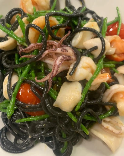 Spaghetti neri leggermente piccanti with calamari, gamberetti, salicornia and pomodorini confit (16 €)