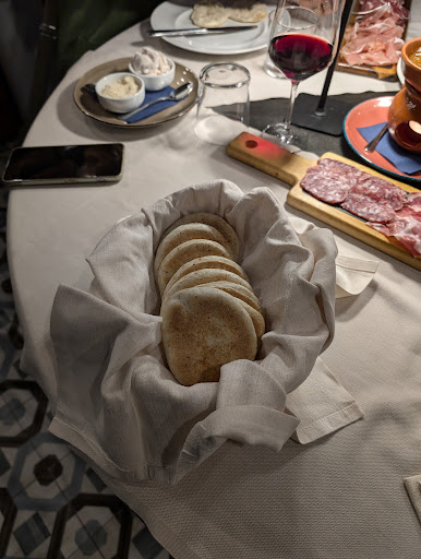 Dinner with dumplings and tigelle, nothing special! Tigelle quite good but when they had cooled down they became dry, the gnocco could have been good but unfortunately it was very greasy, even a piece of gnocco was dripping oil, when I pointed this out I was told "it can happen" cured meats they didn't taste of anything except the raw ham was excellent. Mini table, not suitable for dinner of dumplings and tigelle and various condiments. Sin!