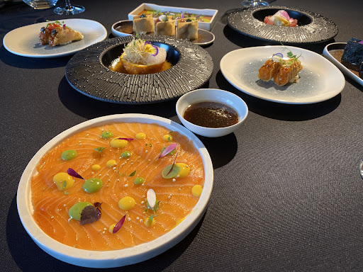 All-you-can-eat sushi. A successful fusion of Eastern and Western cuisine. I was surprised by the use of unusual ingredients for this type of restaurant (cuttlefish, ground truffle, porcini mushroom, extra virgin olive oil, pepper, etc.). Medium size. Cleanliness and service are good. They stock some prestigious commercial wines. Pleasant jazz music in the background (not live, but on a loop). The ingredients are good, except for the scampi and red prawns, which were a bit on the fresh side (see photo). Prices are a bit higher than average.