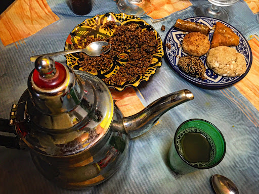 Among the Moroccan specialties, we enjoyed the traditional couscous, desserts, and mint green tea, the latter served with style!