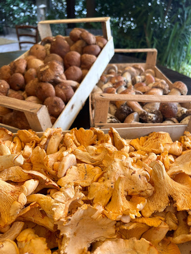 Pizza slices, crostini, Ascoli olives, and fried porcini mushrooms.