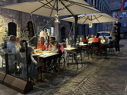 We were fortunate to be able to find a table thanks to some people who had cancelled, and it was a huge stroke of luck. As soon as we entered, we were warmly welcomed. We sat down, and once we'd ordered, the appetizers arrived surprisingly quickly and the portions were generous... not to mention the quality of the cured meats and cheeses. The surprise, however, came later. We had ordered a main course, grilled chicken, and two first courses, strangozzi with saffron and porcini mushrooms and strangozzi alla norcina, which were one of the best truffle pasta dishes I've ever eaten: the truffle aroma and flavor were fantastic... and they didn't overpower the sausage at all, which was also outstanding. Once again, the portions were super generous. We finished with dessert, and here too, I have to make a point: their crema al postacchio is out of this world. I'll end by saying that we'll gladly return on our next trip to Assisi and highly recommend eating there. Perhaps with a little more ventilation, it would be perfect, but nothing major. Particular and great credit goes to the waiter/cashier who manages to handle busy evenings like today's while maintaining professionalism and a smile.
