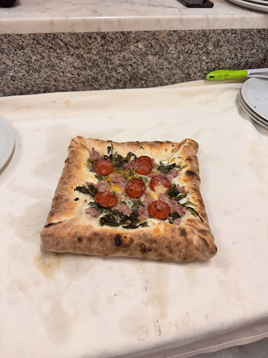 We celebrated our son's 13th birthday with friends, expecting to find a classic pizzeria with long tables and a somewhat casual atmosphere. Instead, the tables are round, allowing for conversation with everyone, a beautiful atmosphere, and excellent pizza.