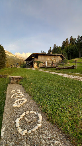 Followed the access road from Val Noana. A steady climb, with sometimes challenging but never impossible sections. The route near the waterfall (a spring of very fresh water) is fantastic, where the road follows a section carved into the rock. Read the explanatory signs! Arrival at the refuge in an idyllic setting amidst flat meadows and dense surrounding woods. A warm welcome awaits. Excellent menu (a trio of delicious dumplings and spätzle) enjoyed at outdoor tables. Prices more than match the setting. Before setting off, weather permitting, sit outside, overlooking the valley's sunny meadows, sip a glass of herbal grappa and... meditate!