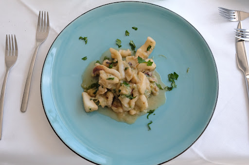 We had two appetizers and two first courses, each accompanied by a bottle of wine: grilled caciocavallo cheese, stuffed mussels, linguine with citrus pesto and shrimp, and troccoli allo scoglio. All the dishes were delicious and, I'd say, generous—truly excellent.