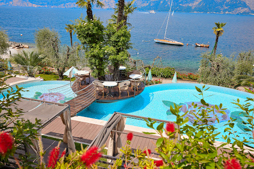 A fantastic hotel in a prime location right on the lake. Includes a small beach area with loungers.