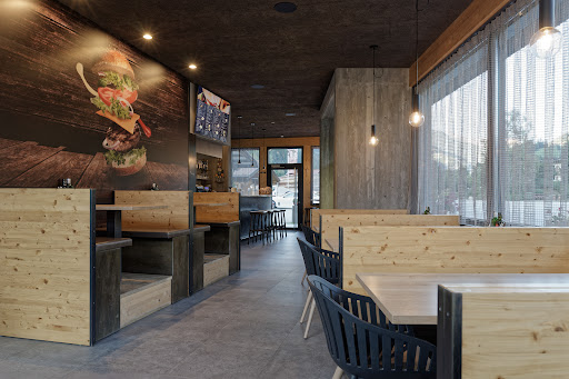 Fast food on the main road with ample parking. Delicious burgers, hot dogs, and fried foods, generously sized and made with excellent ingredients. If you're tired of dumplings, strudel, goulash, and speck, this is the perfect place. You order at the counter, they give you a buzzer, and when it rings, you go and get your tray with your order. Friendly and helpful staff.