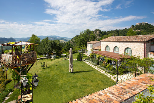 The Saiano estate is located in the hills of Rimini, near Torriana, in the Marecchia Valley. We went for dinner one evening in early August. Reserved, beautiful marble tables offer a breathtaking nighttime view of the state of San Marino. A pleasant place surrounded by greenery. We ate grilled pork and lamb, a side of potatoes, and a selection of cheeses to finish. We also drank a bottle of their own red wine. They produce wine, oil, and jams. They also have rooms for overnight stays. But the real gem is a table at the top of a tree that can only be reserved online. The reservation line is incredibly long, and the menu is a fixed price. A must-visit with friends or for an intimate dinner. Recommended!
