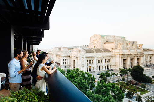 A sophisticated atmosphere and a beautiful view of Milan's central station, along with excellent service.