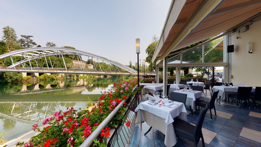 Very nice restaurant with a terrace overlooking the river, excellent food, the gourmet pizzas are really good, perfect for an evening in good company
