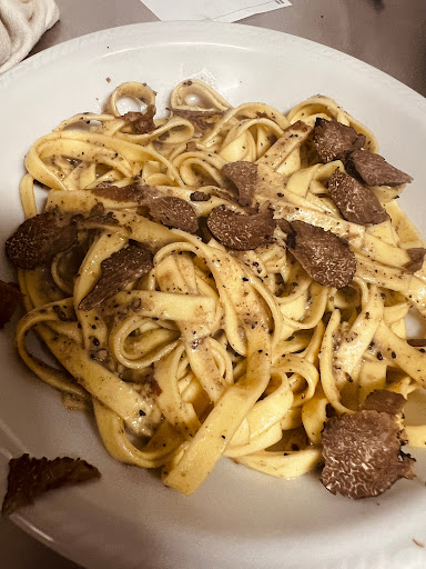After a lovely circular hike in the surrounding mountains, we arrived at 2:30 PM at this unfamiliar inn, hoping to grab a bite to eat given the time. To our surprise, they greeted us with a truly impressive menu: we chose veal with tuna sauce and tagliatelle with porcini mushrooms, finishing with wild berry tart and chocolate cake.