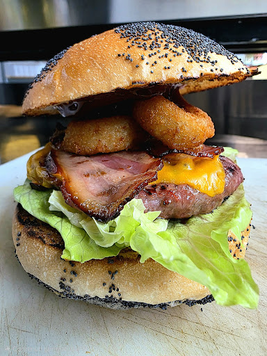 Despite a small technical issue with the wait times and despite one of my guests "scolding" the person serving us (due to the significantly longer wait times due to takeout orders), the staff was very professional and kind and didn't respond; on the contrary, they offered (my compliments). The wait was made up for by the deliciousness of the four burgers 🍔 in the freshly baked puccia, the meat was delicious. We were returning from Maglie towards Taranto and stopped in thanks to the recommendations of a couple we asked for information. The puccia in the photo consists of: lettuce, mixed burger, cheddar, crispy bacon, onion rings, BBQ sauce, and fries.